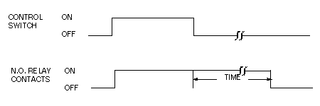 DELAY ON RELEASE - Input voltage must be applied continuously to operate the internal relay. When the control switch is closed, the relay energizes. When the control switch is opened, timing begins. When timing is complete, the relay will de-energize. Time may be reset to zero during timing by closing the control switch.